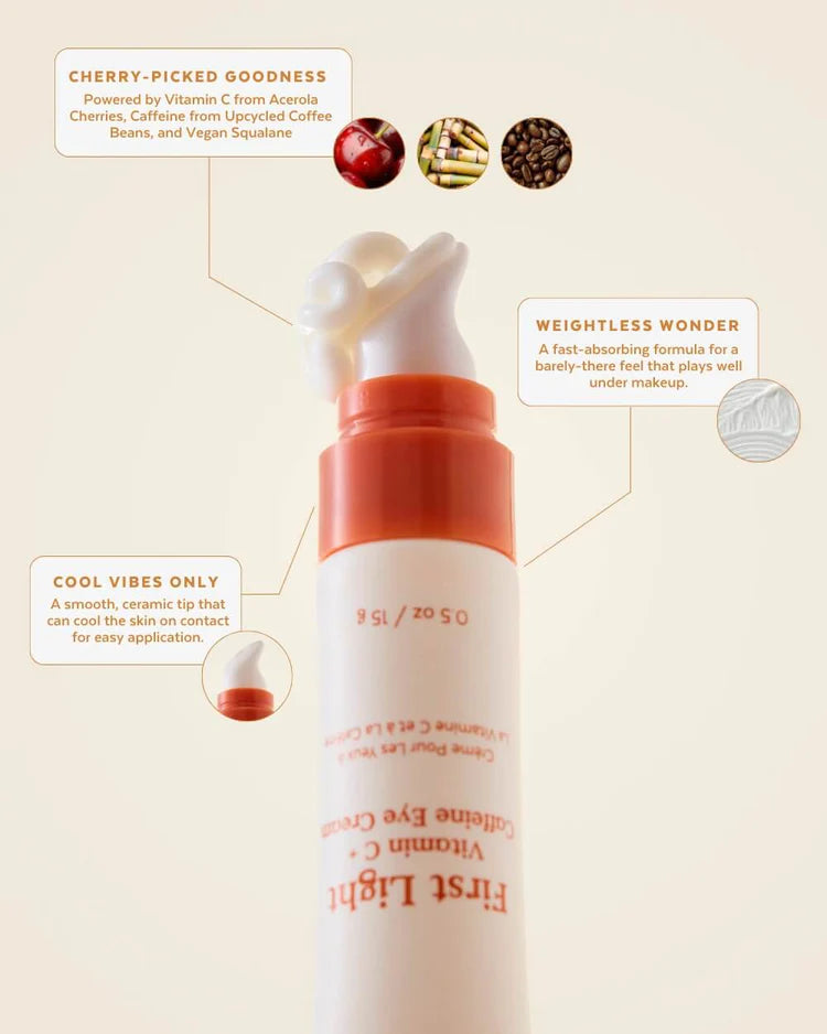 Give your under eye area an instant brightness boost. Powered by a gentle form of Vitamin C derived from Acerola Cherries and Caffeine sourced from upcycled coffee beans, this fast-absorbing eye cream reduces the appearance of dark circles and visibly de-puffs, while treating the delicate skin under your eyes with kindness. Vegan Squalane adds lightweight hydration with no greasy residue, so your concealer won’t melt away. Use the cooling, hygienic ceramic tip to massage on for even more soothing + de-puffing benefits. Clinically tested and safe for all skin types, including sensitive.